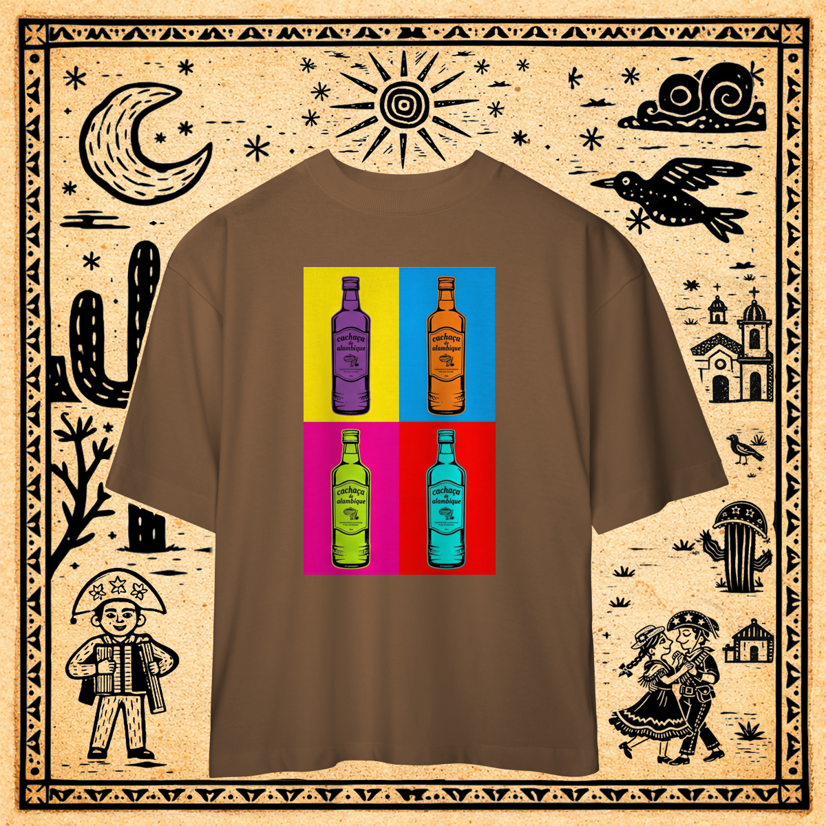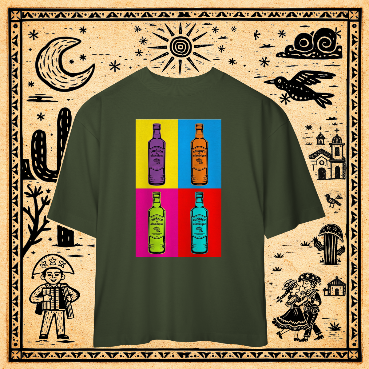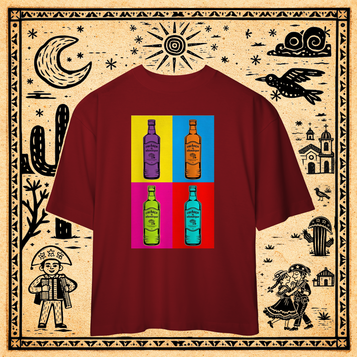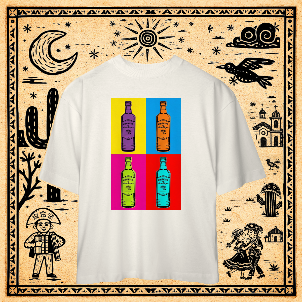 Esta estampa transforma a garrafa de cachaça popular, com seu rótulo desenhado à mão, em um objeto de arte serializado.