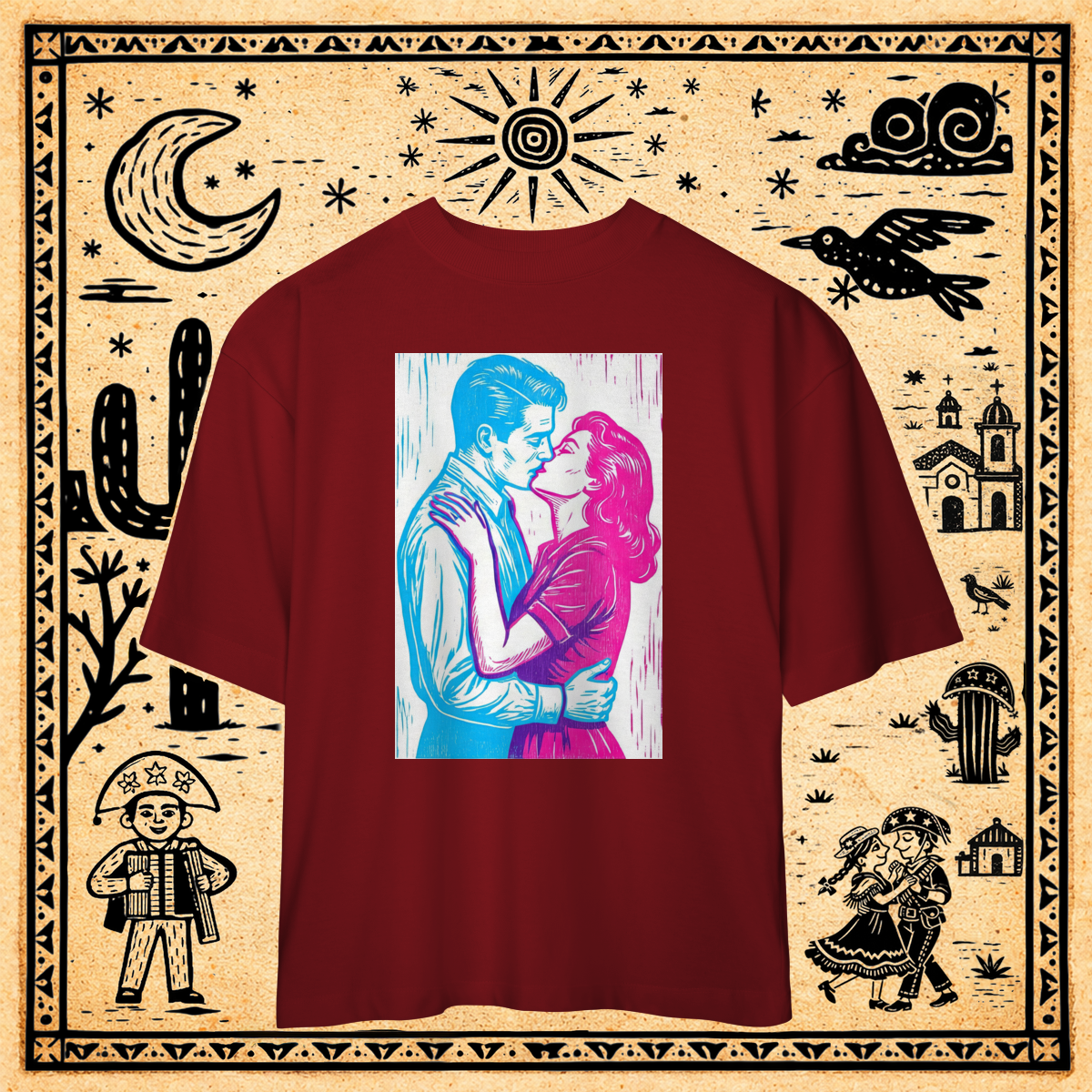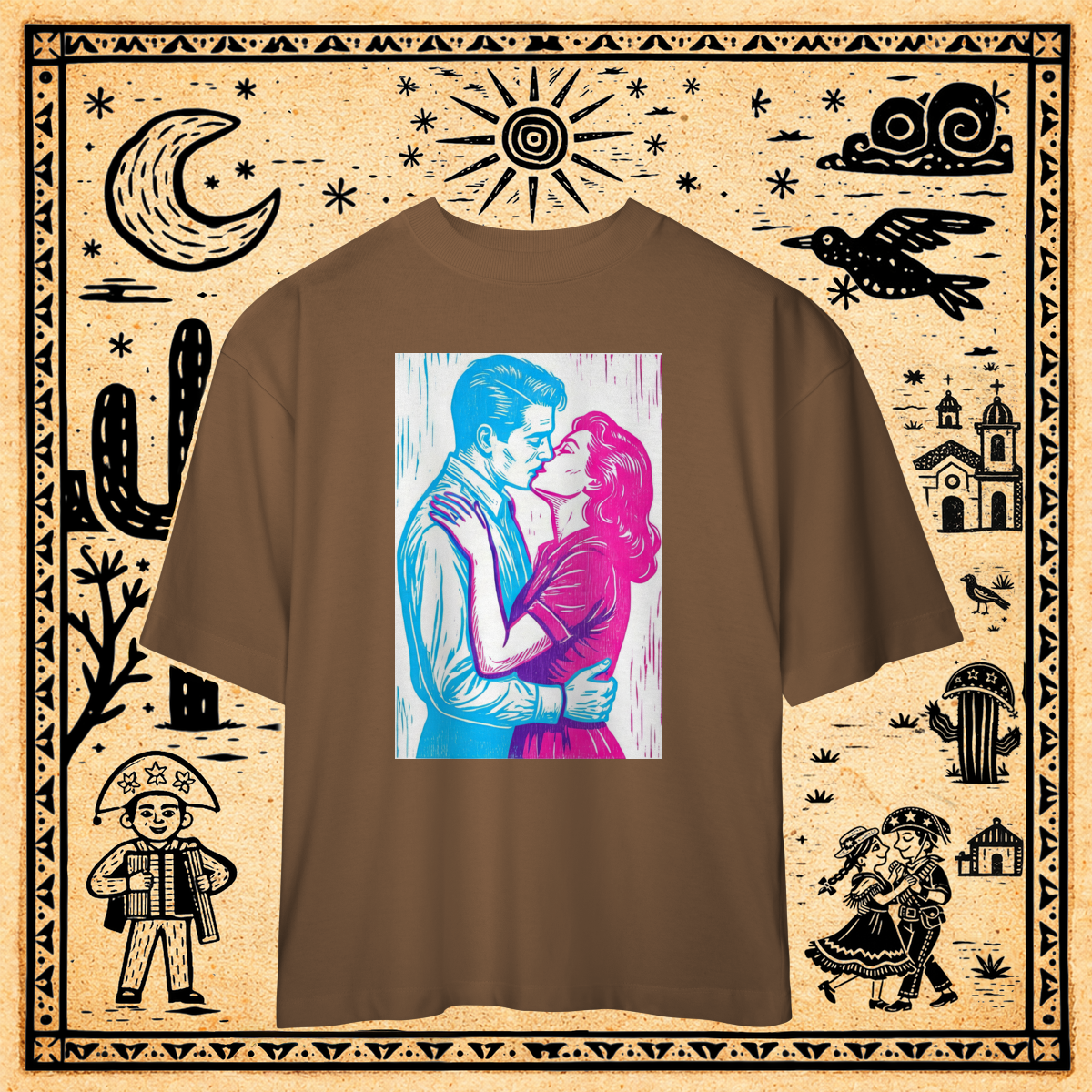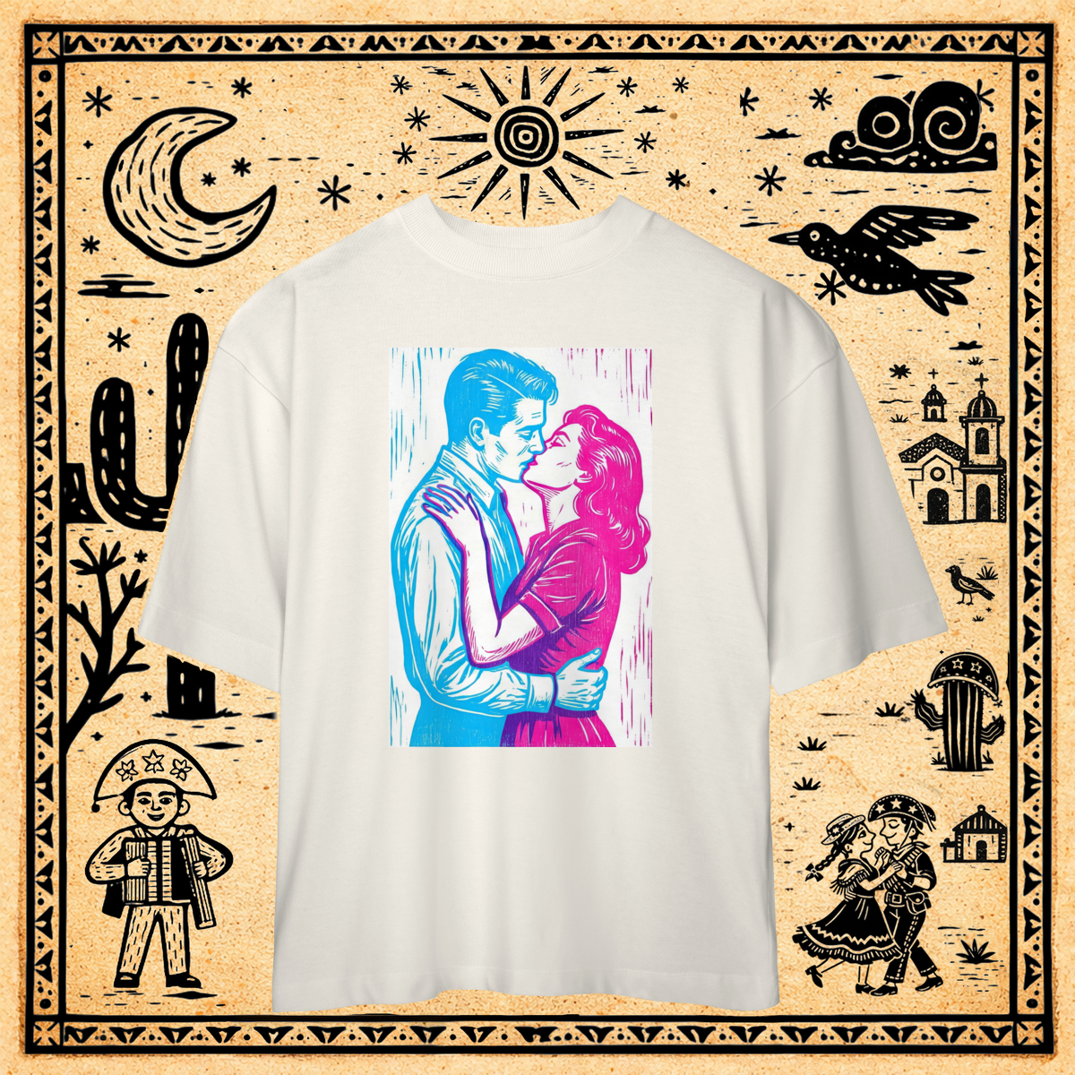 O misprint (erro de impressão) proposital, com o desalinhamento vibrante entre o azul turquesa elétrico e o rosa choque, cria uma vibração visual que tira a arte popular do passado e a joga direto no presente.