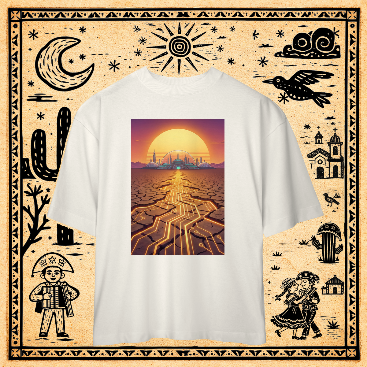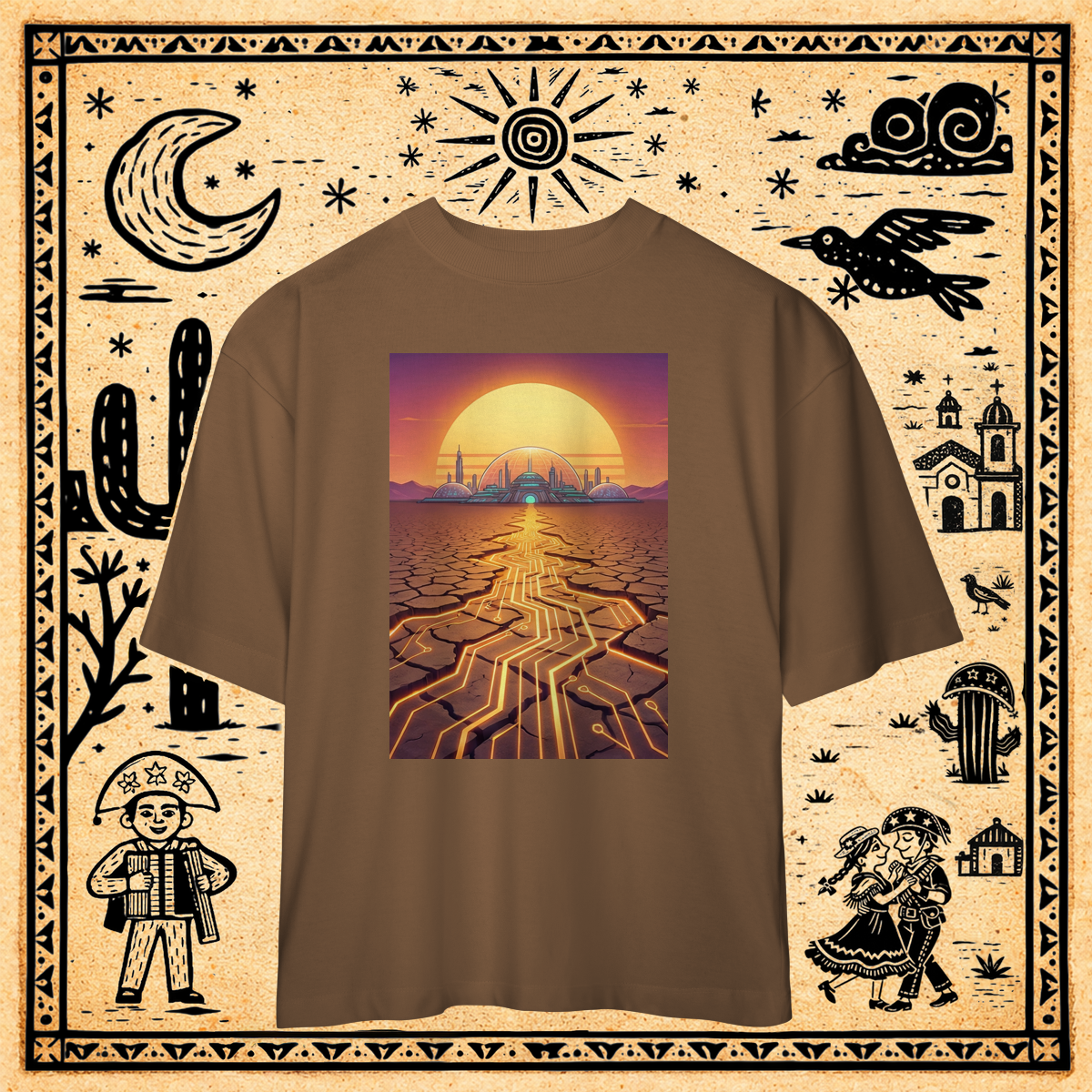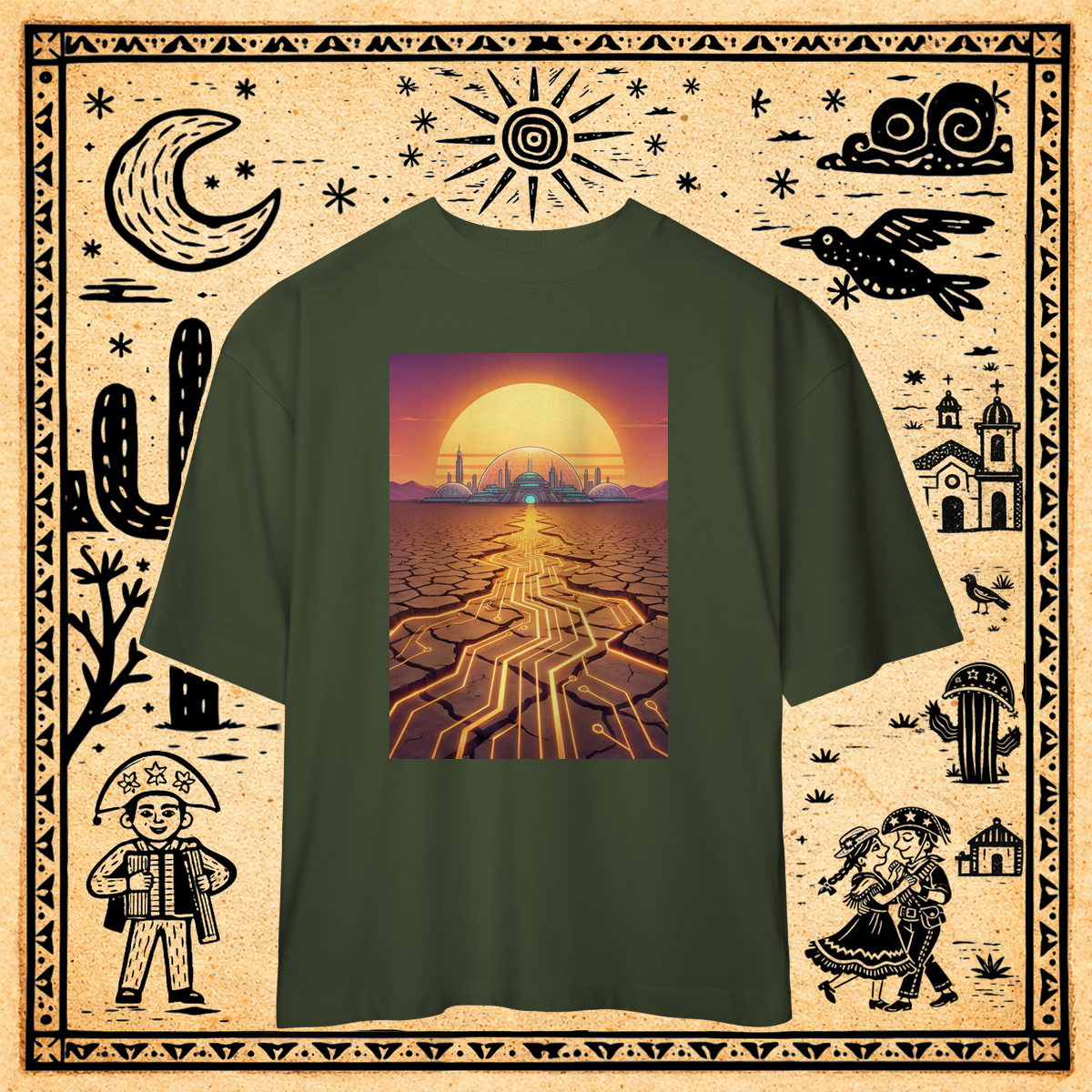 As rachaduras icônicas do solo seco não representam mais morte, mas sim canais de energia brilhante que formam um imenso circuito integrado no chão.