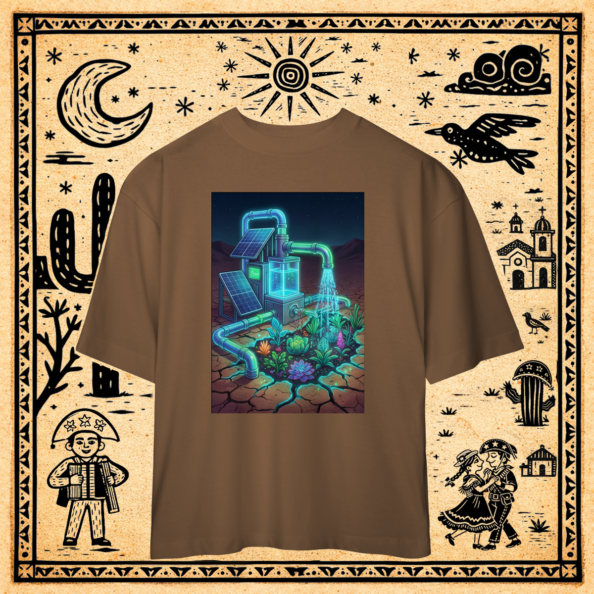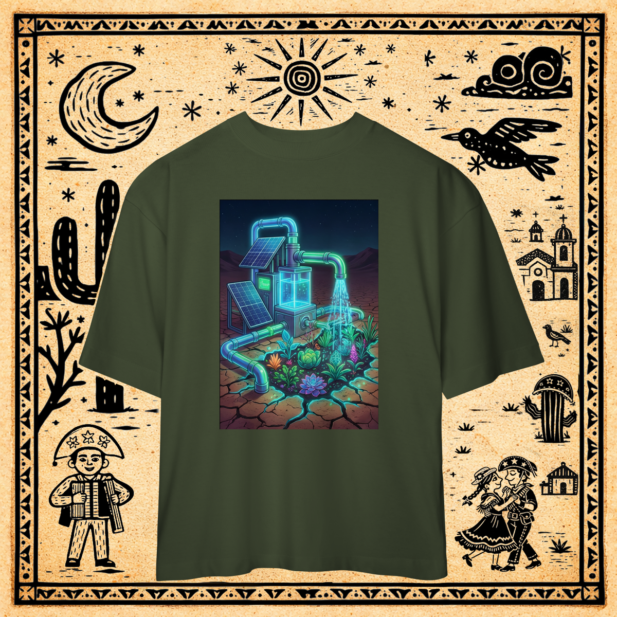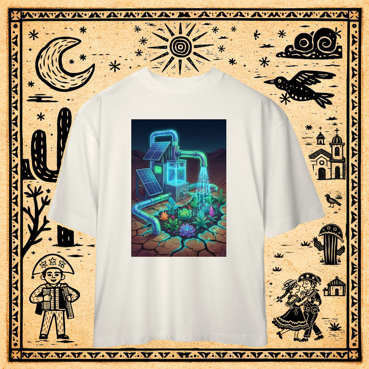 Esta estampa retrata o triunfo da engenharia Solarpunk: uma estação de bombeamento holográfica e futurista que extrai e purifica a umidade do ar.