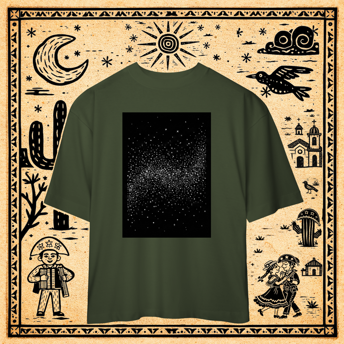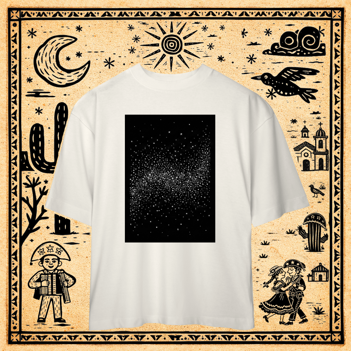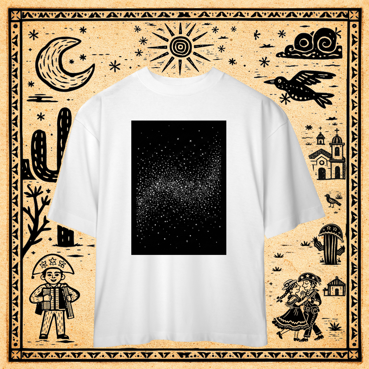 Sobre um fundo preto profundo, uma nuvem densa e concentrada de milhares de pequenos pontos brancos, cruzes e formas geométricas minúsculas forma uma faixa rodopiante no centro, evocando a textura do "caos organizado" da Via Láctea.