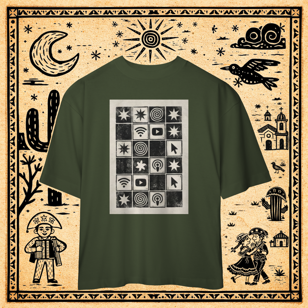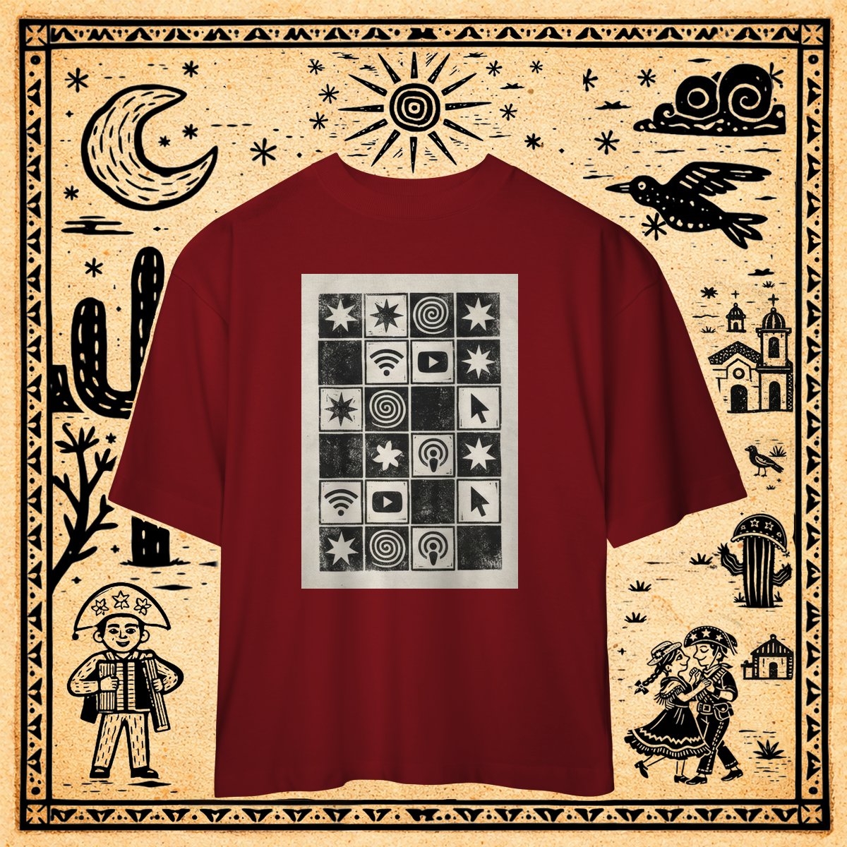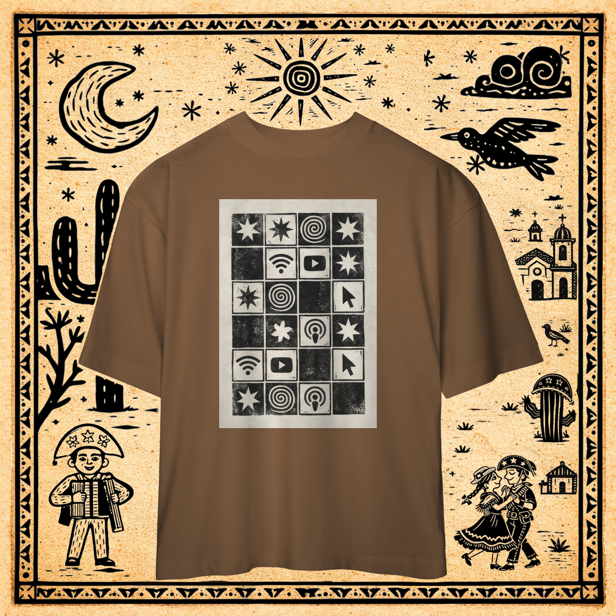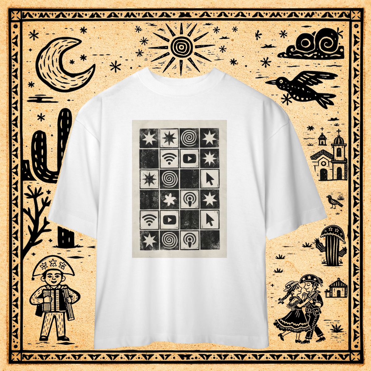 Nesta estampa, a xilogravura ganha um upgrade de sistema. Símbolos ancestrais (estrelas, sóis) dividem o espaço com ícones de Wi-Fi, cursores e "play buttons", todos renderizados com a mesma estética rústica e falhada da impressão manual.