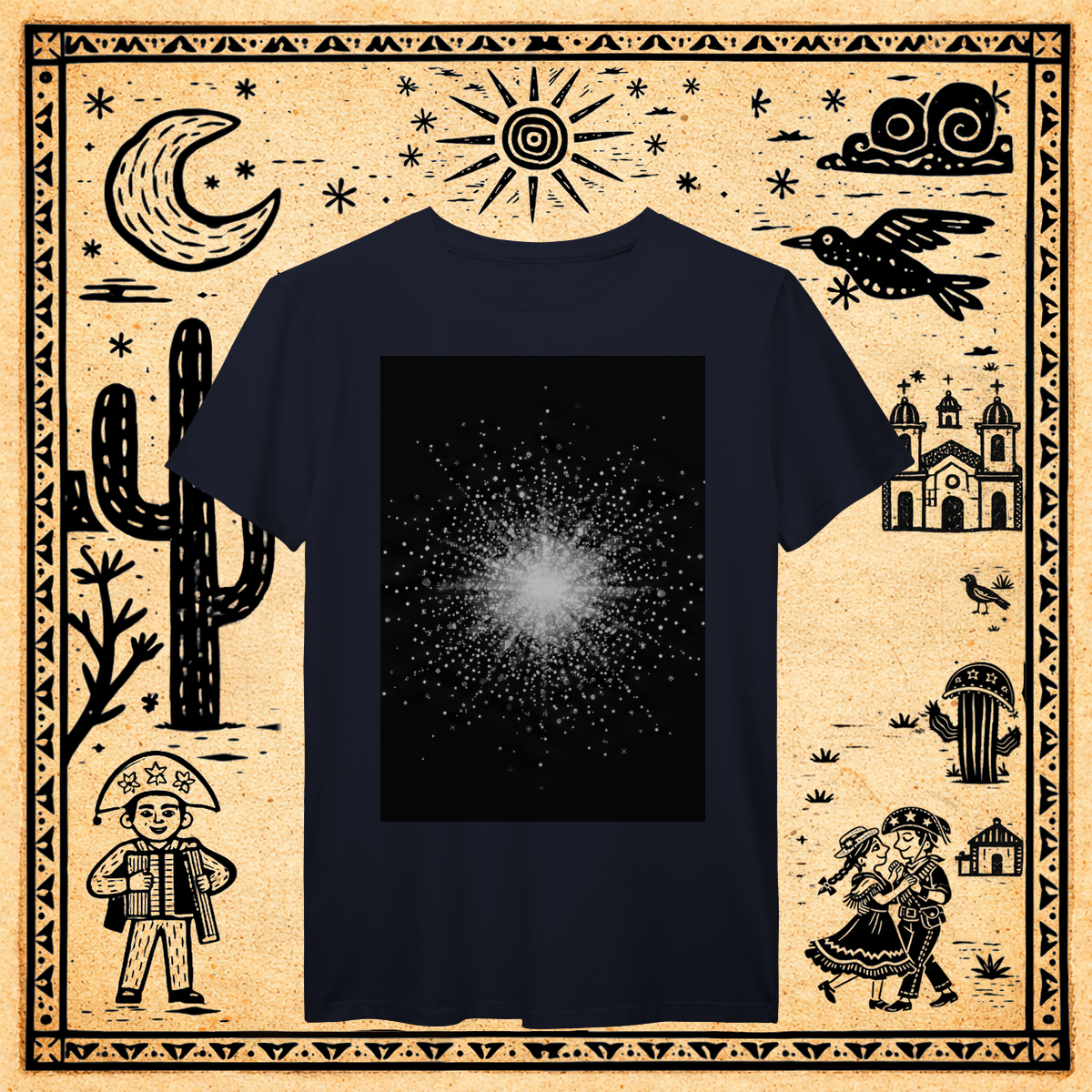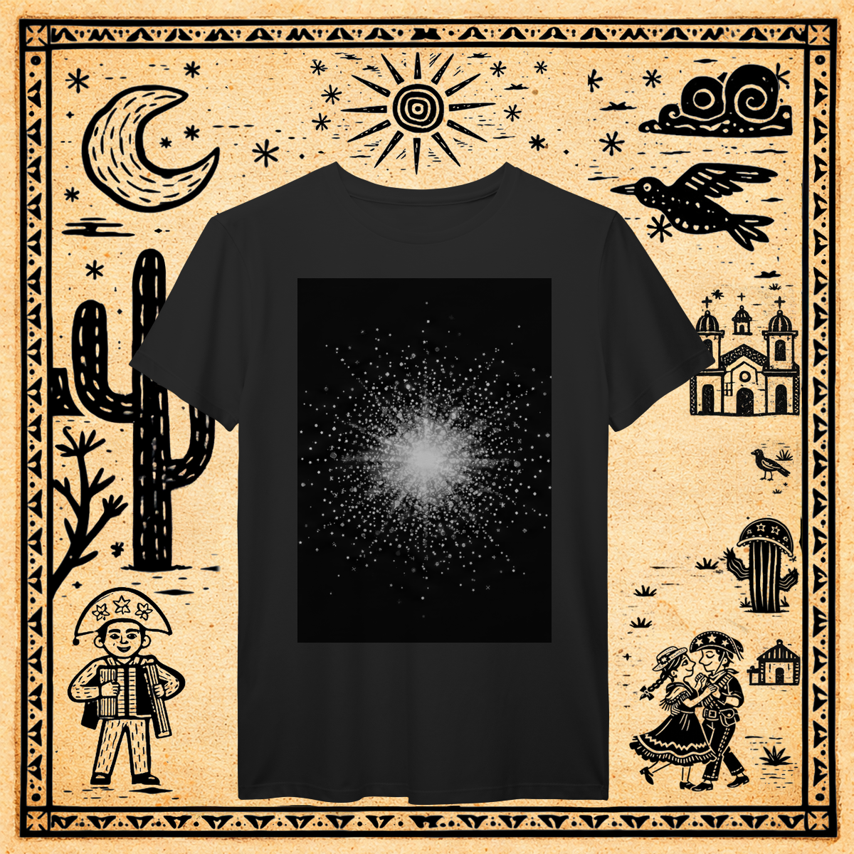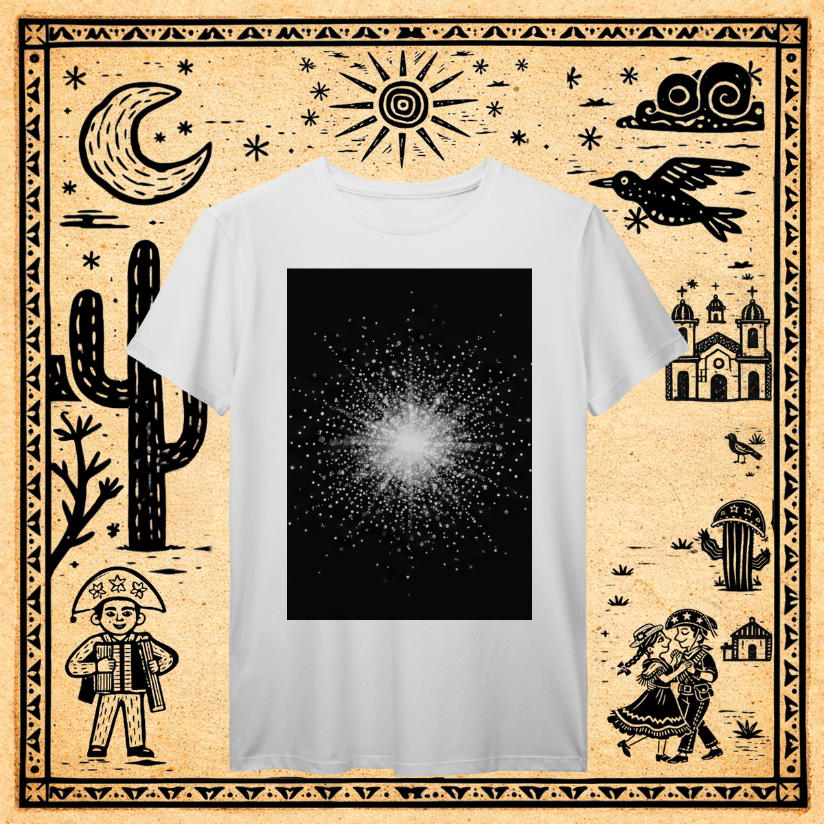 Um ponto de luz central explode em um campo denso de pequenos pontos brancos e estrelas digitais sobre um fundo preto profundo, criando uma sensação de expansão cósmica e tecnológica.