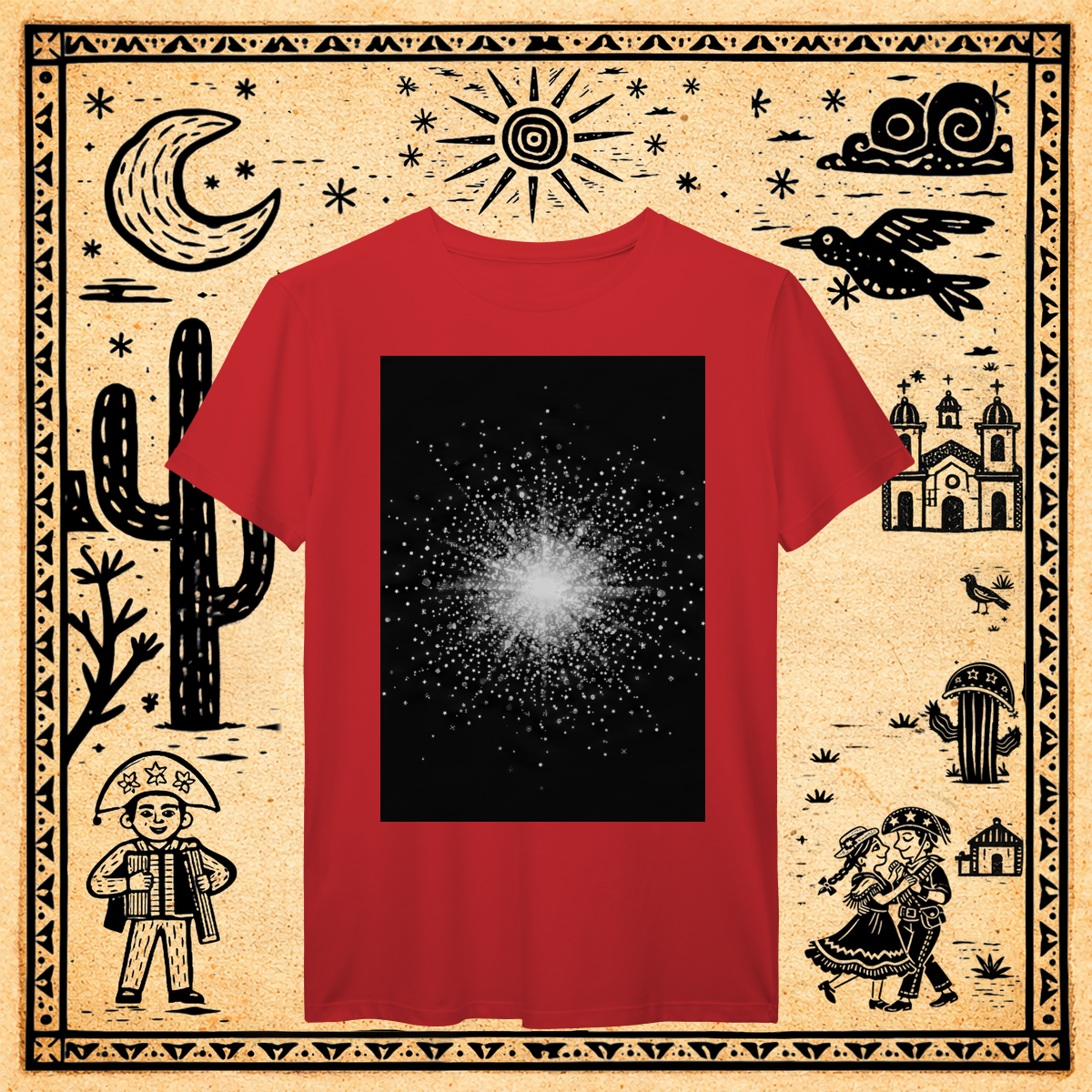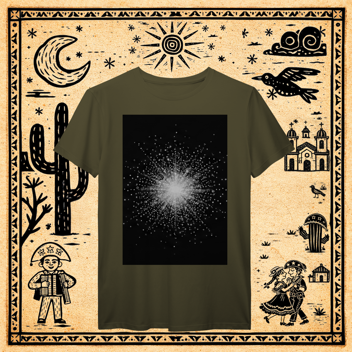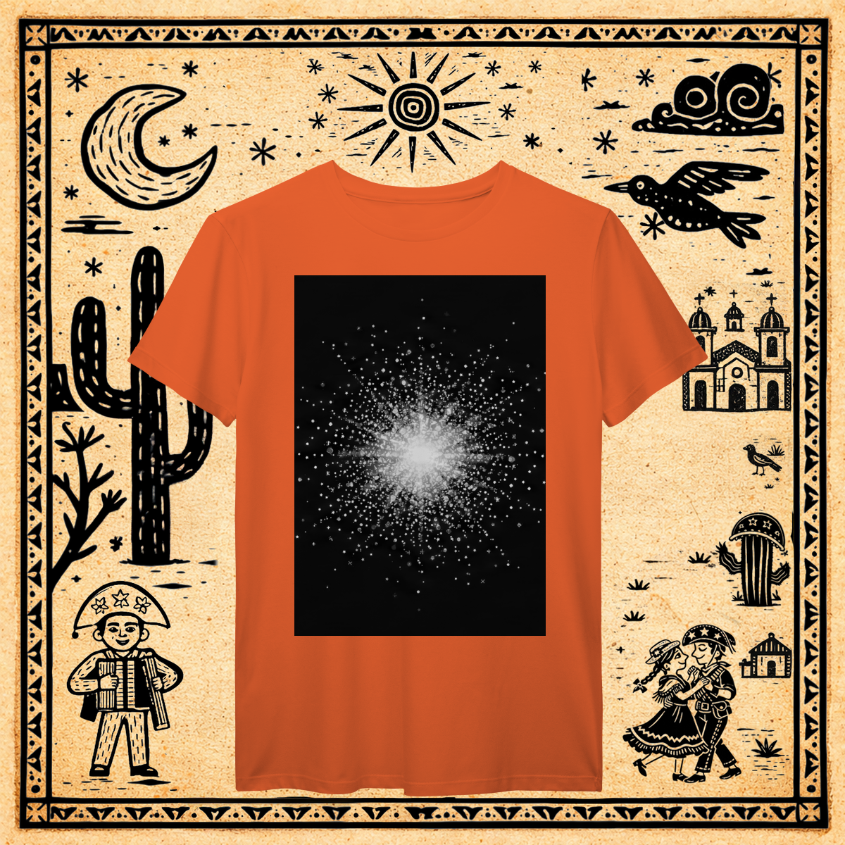 Um ponto de luz central explode em um campo denso de pequenos pontos brancos e estrelas digitais sobre um fundo preto profundo, criando uma sensação de expansão cósmica e tecnológica.