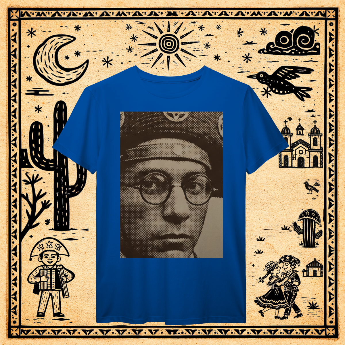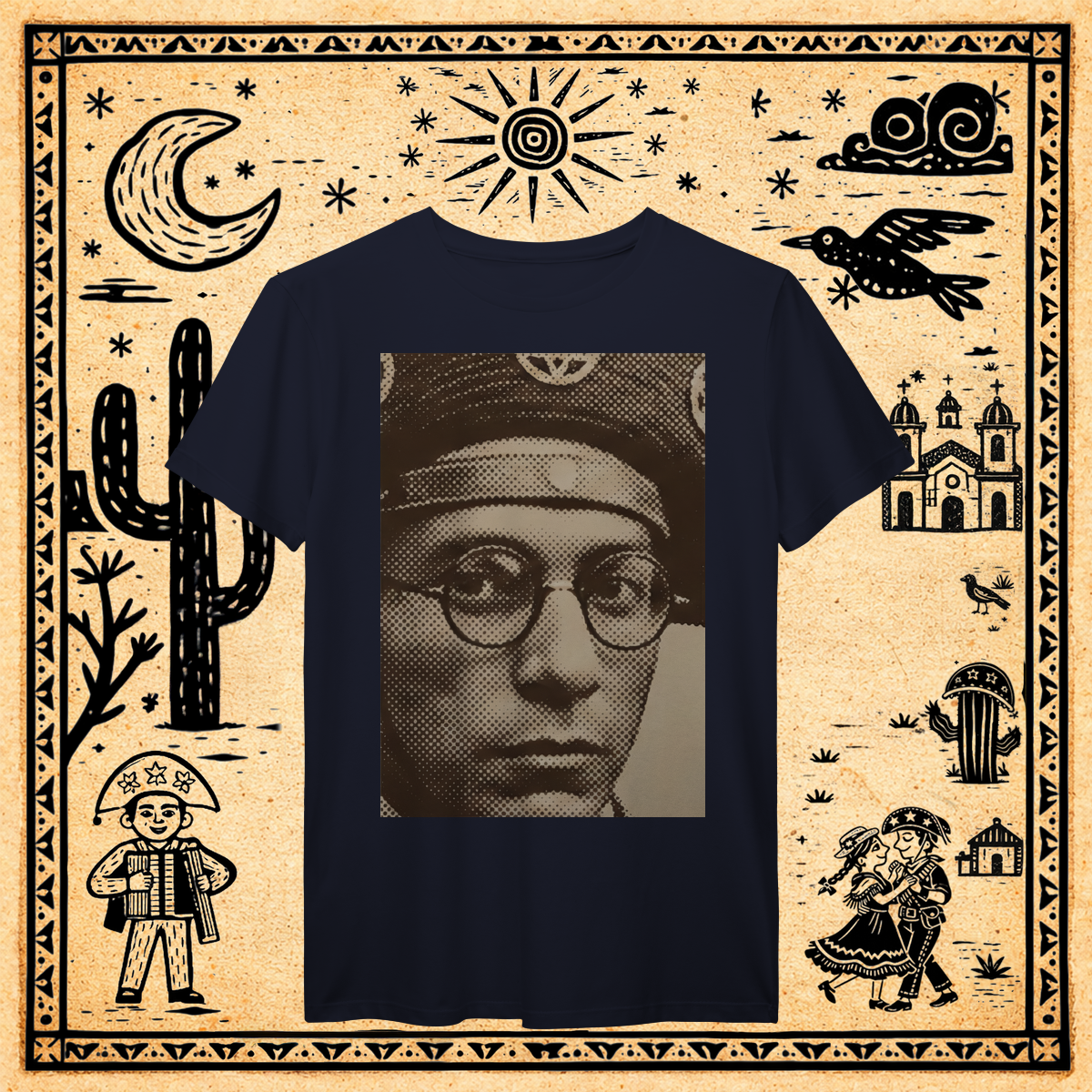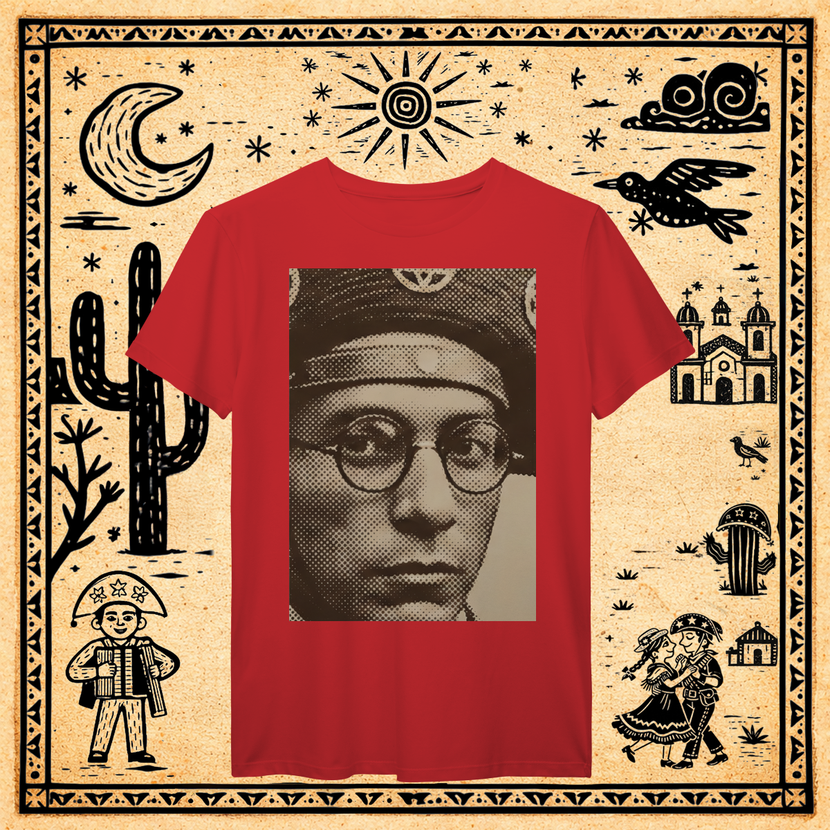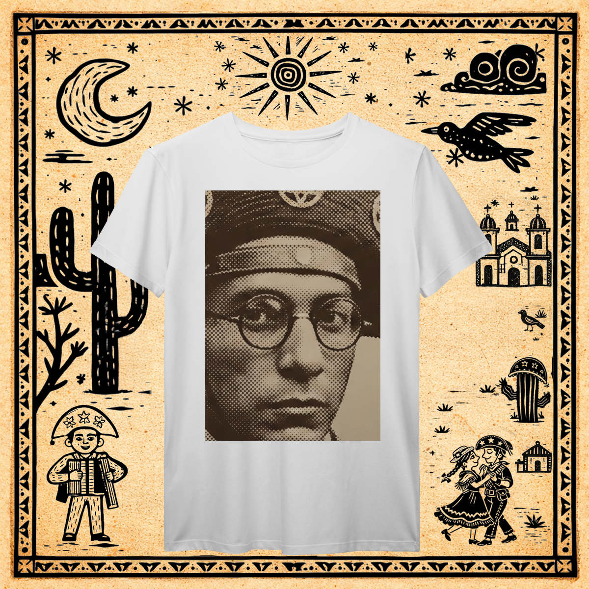Utilizando a técnica de halftone (retícula de impressão) ampliada ao extremo, focamos apenas no recorte mais icônico: o olhar através dos óculos redondos.