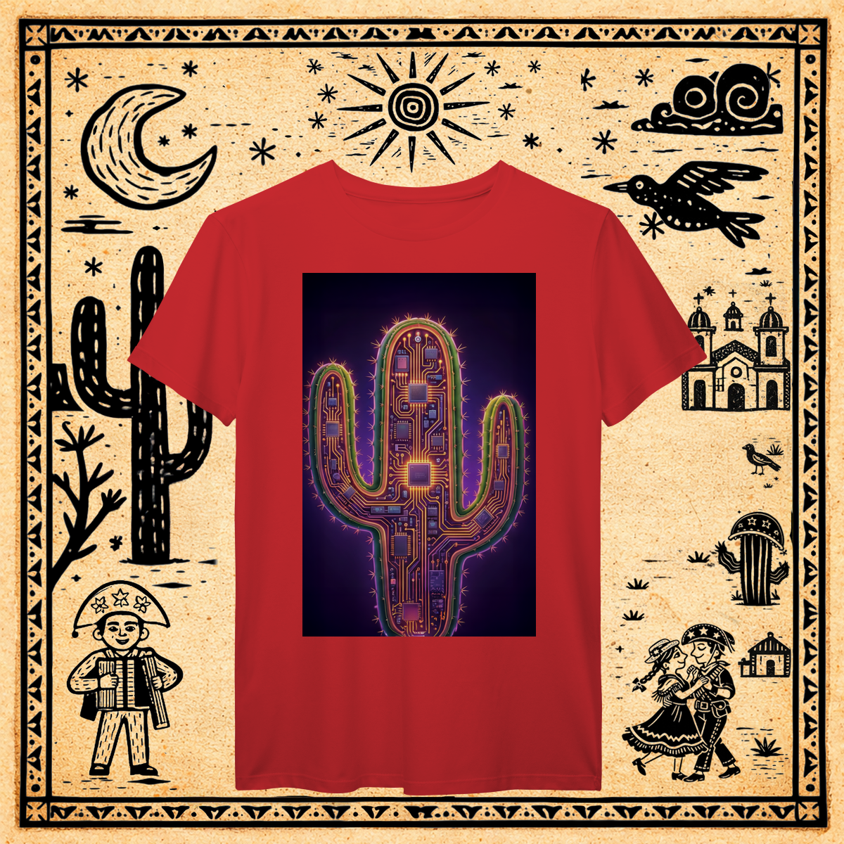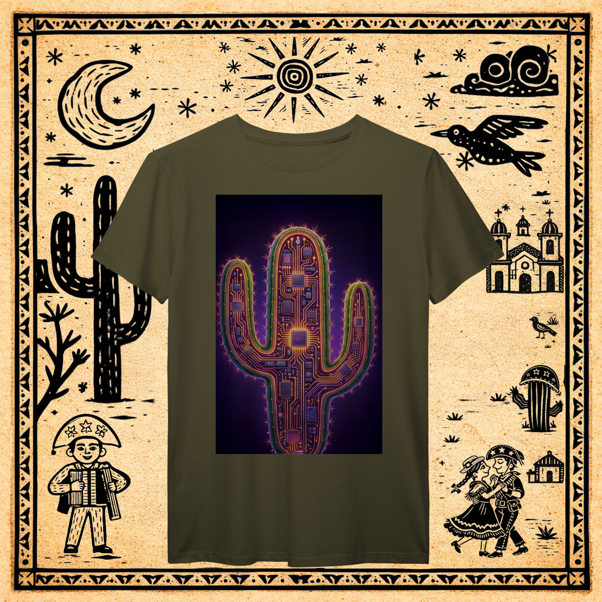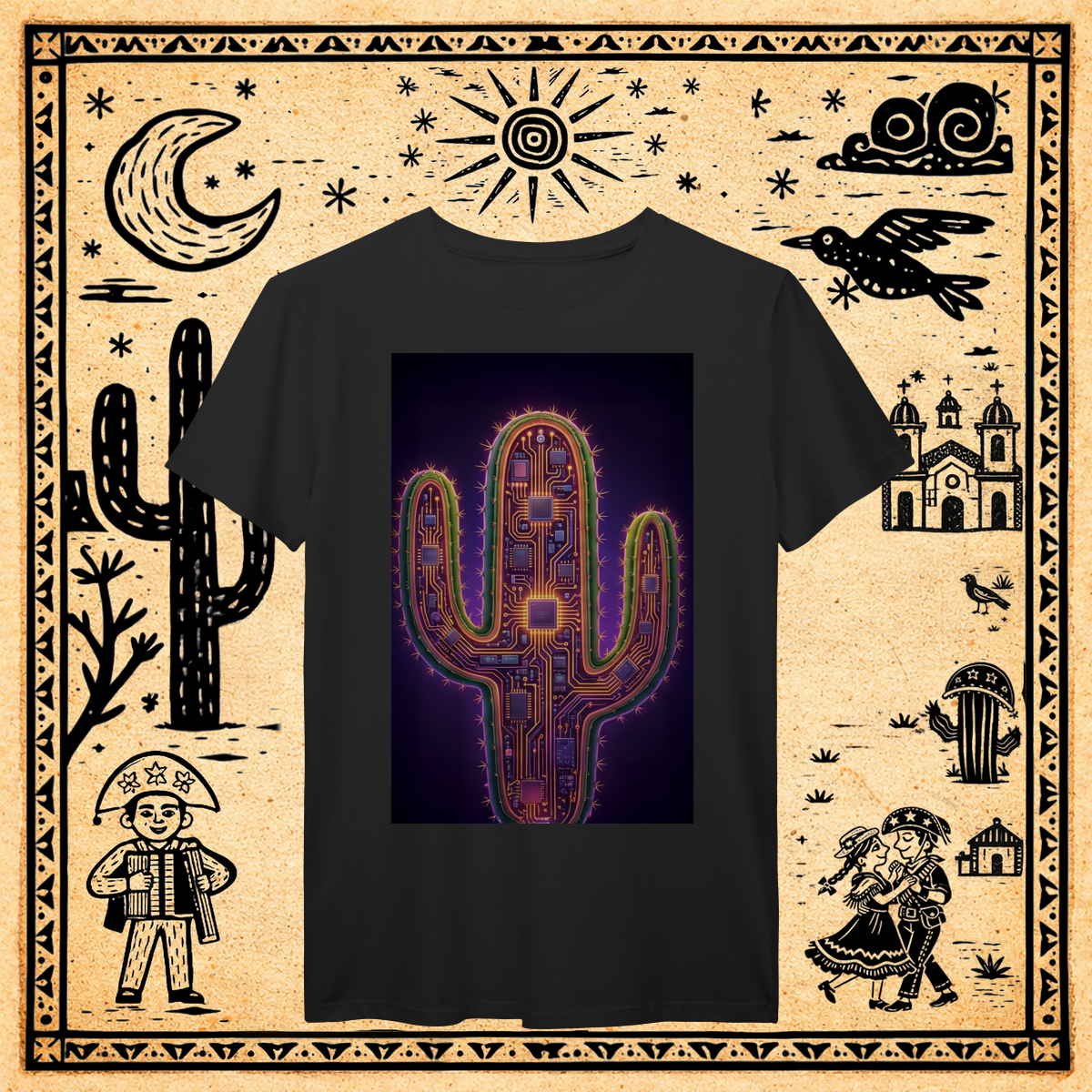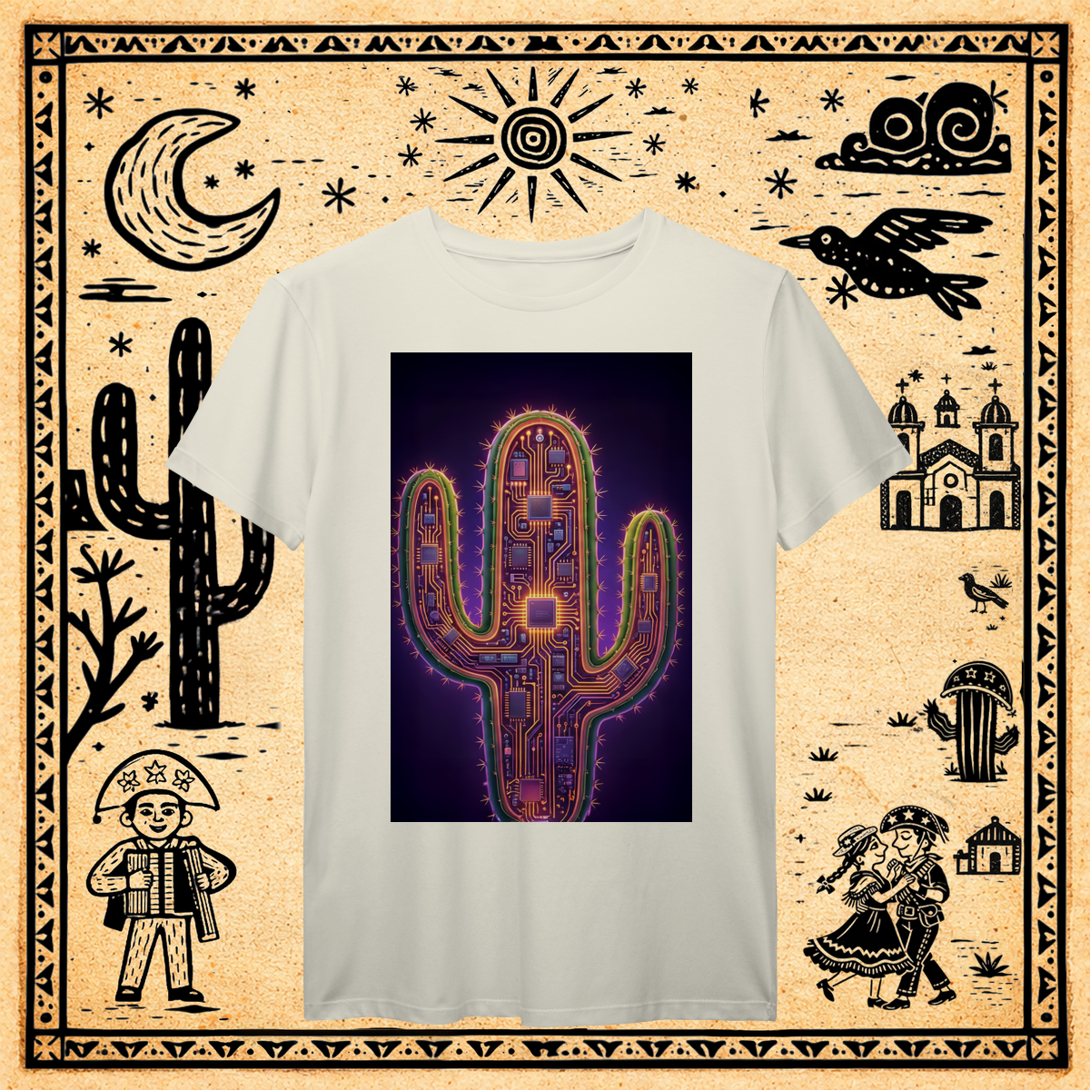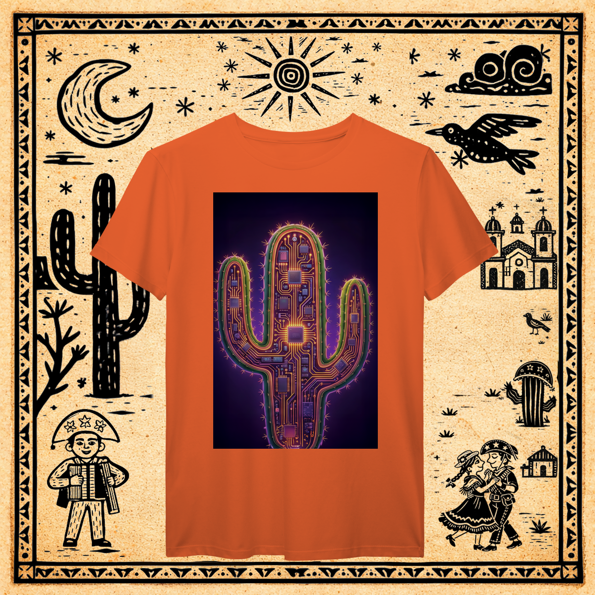 Nesta visão em corte transversal (raio-x), revelamos a verdade do ano 2077: o interior do Mandacaru não é feito de polpa e fibras, mas de uma complexa rede de microchips, processadores e trilhas de dados brilhando em laranja e roxo elétrico.