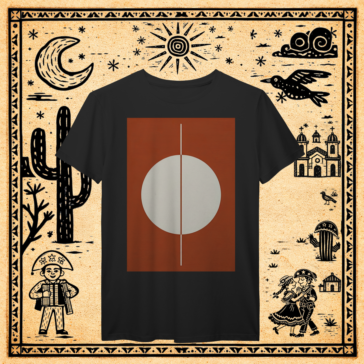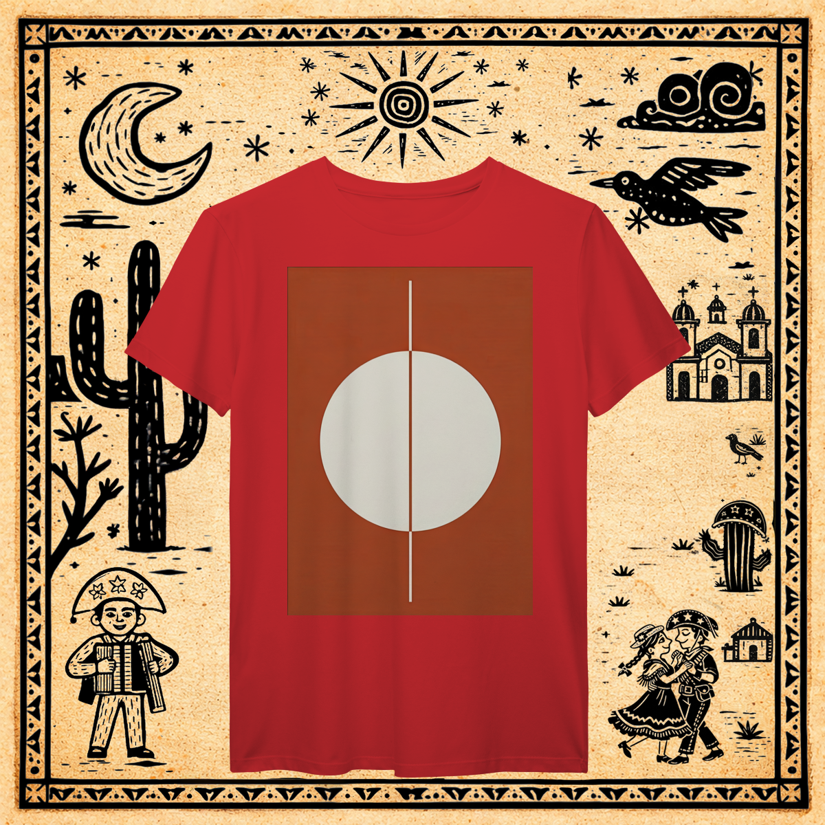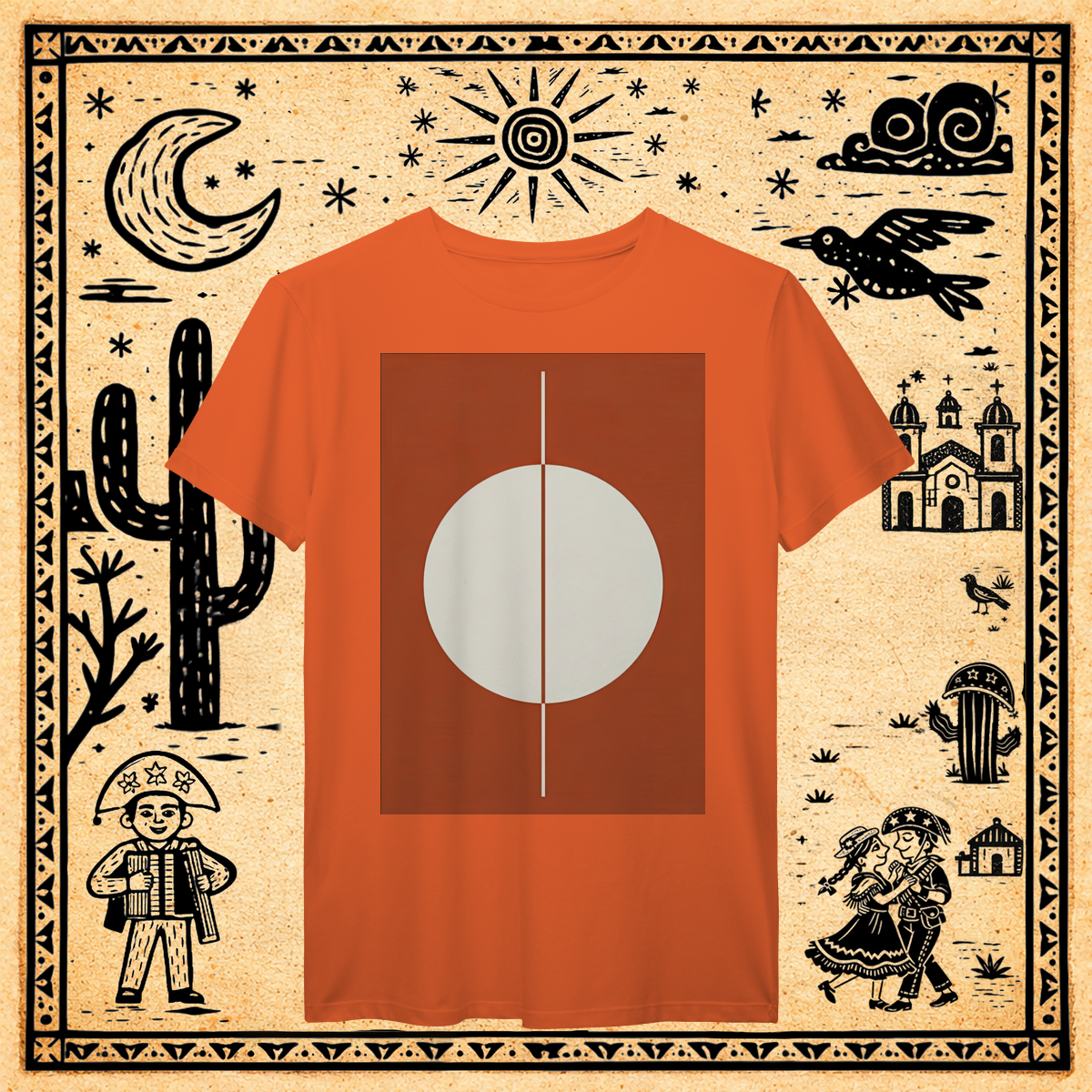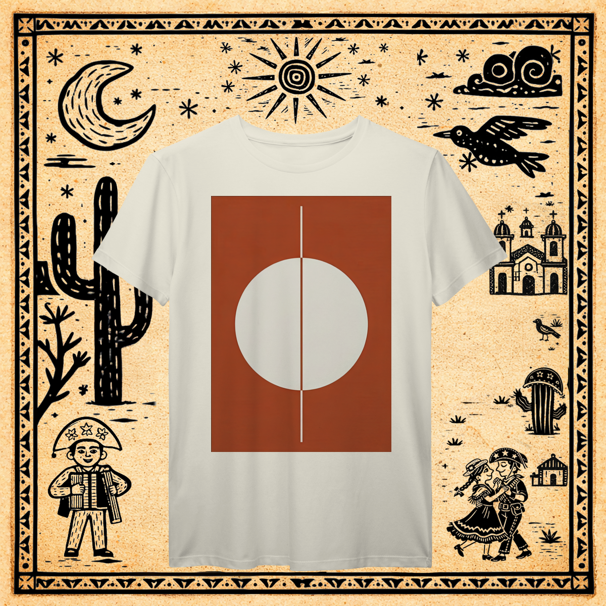 Com uma estética minimalista extrema, um grande círculo perfeito em tom off-white destaca-se sobre um fundo terracota profundo.