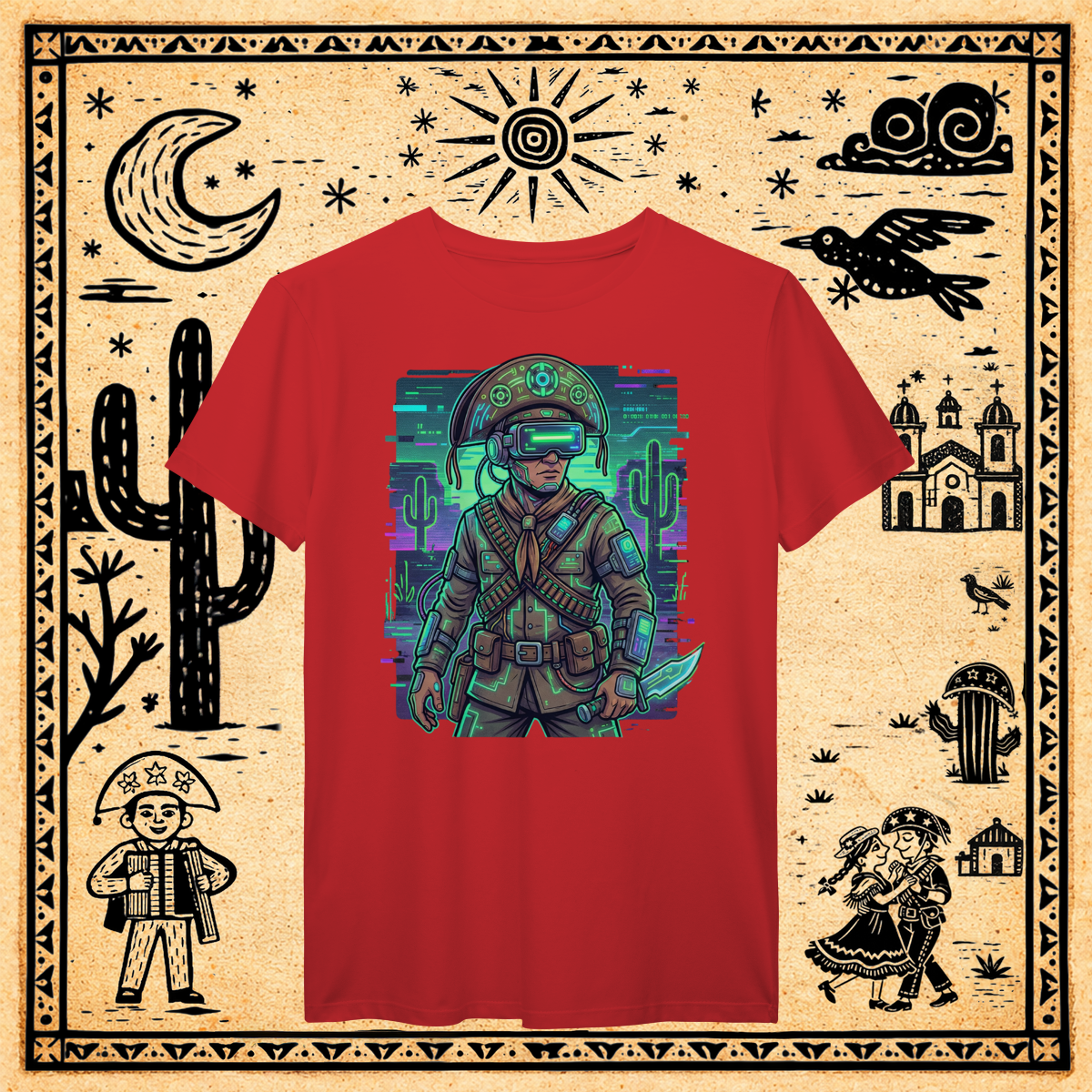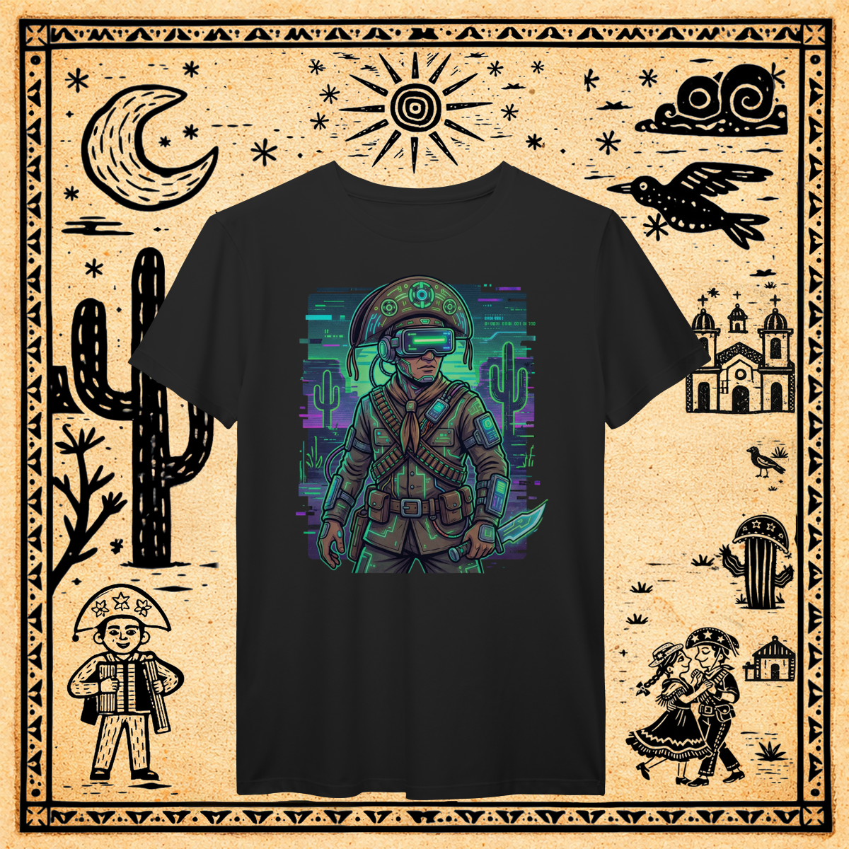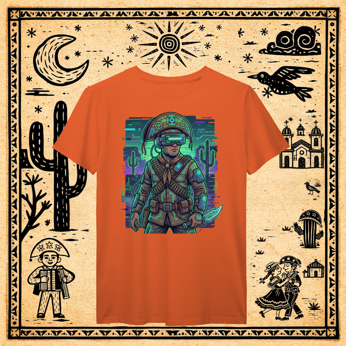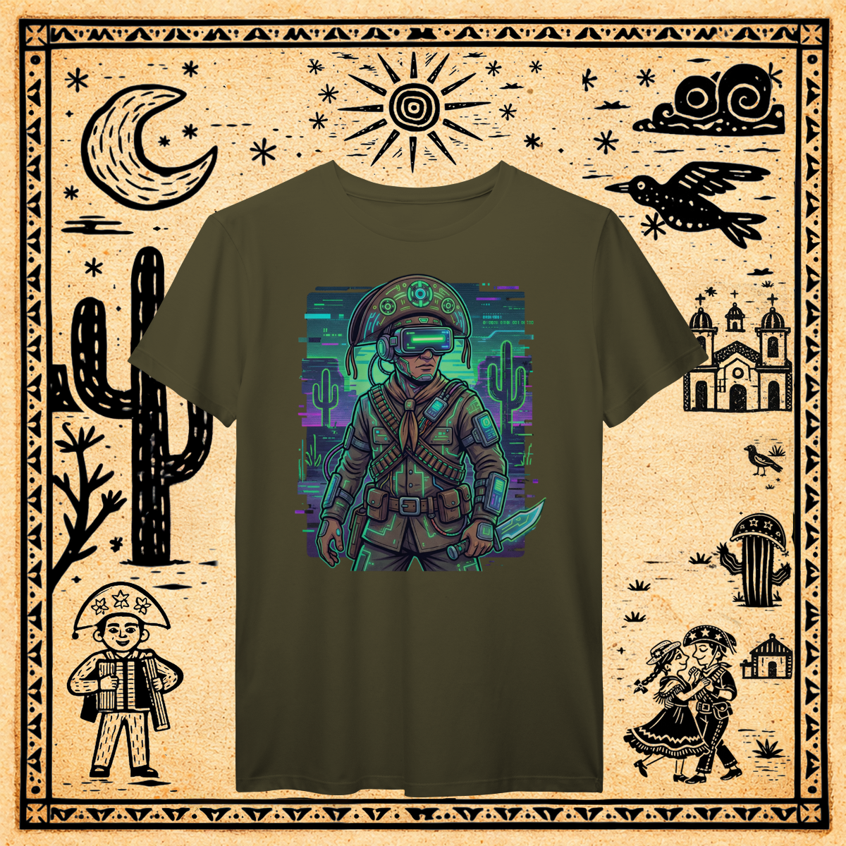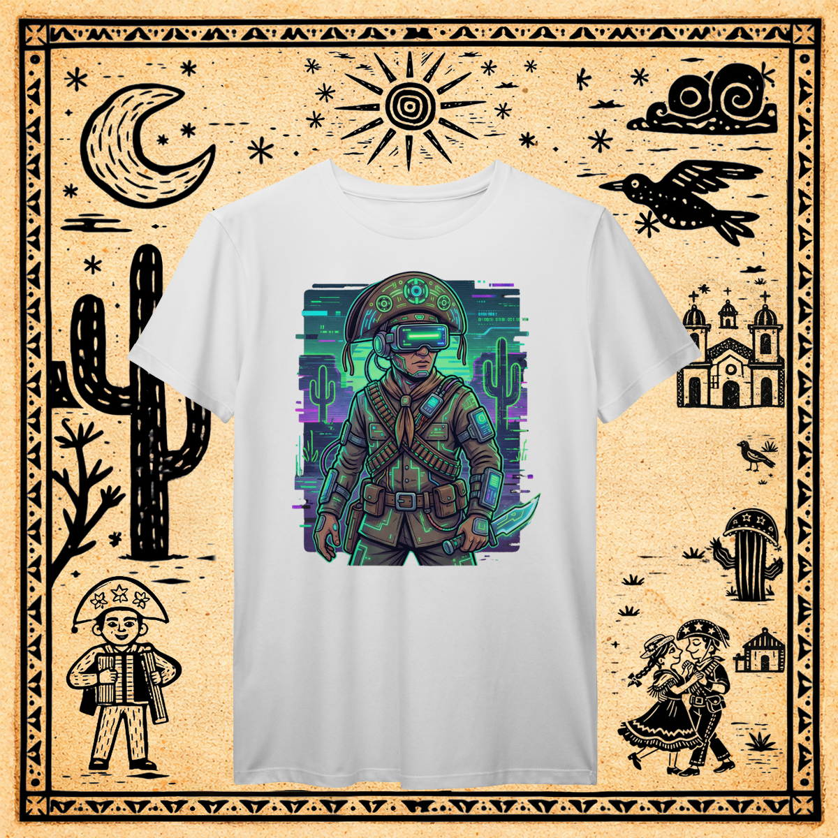 Esta estampa imagina o ícone máximo do sertão adaptado para as novas fronteiras digitais: o chapéu de couro permanece, mas a visão agora é aumentada por visores de realidade virtual e trajes táticos com detalhes em neon.