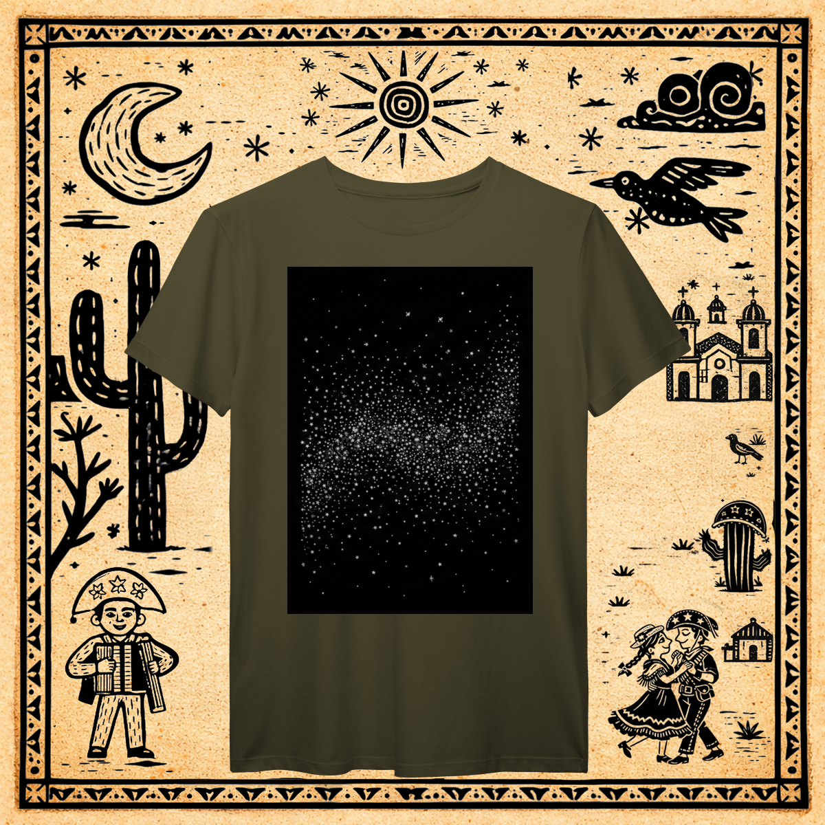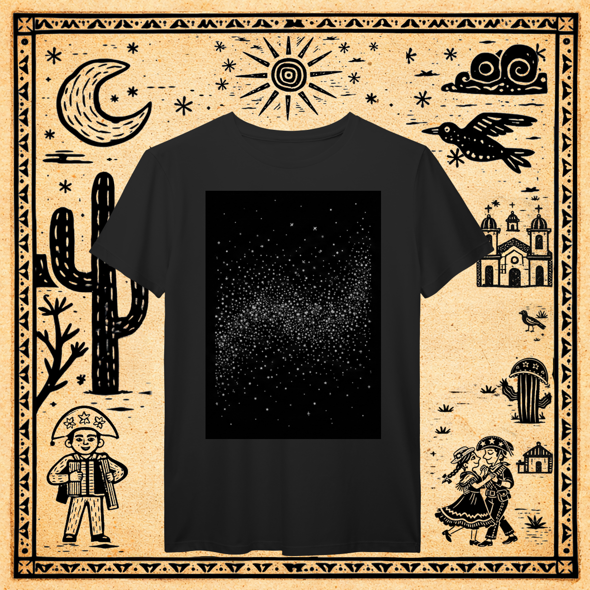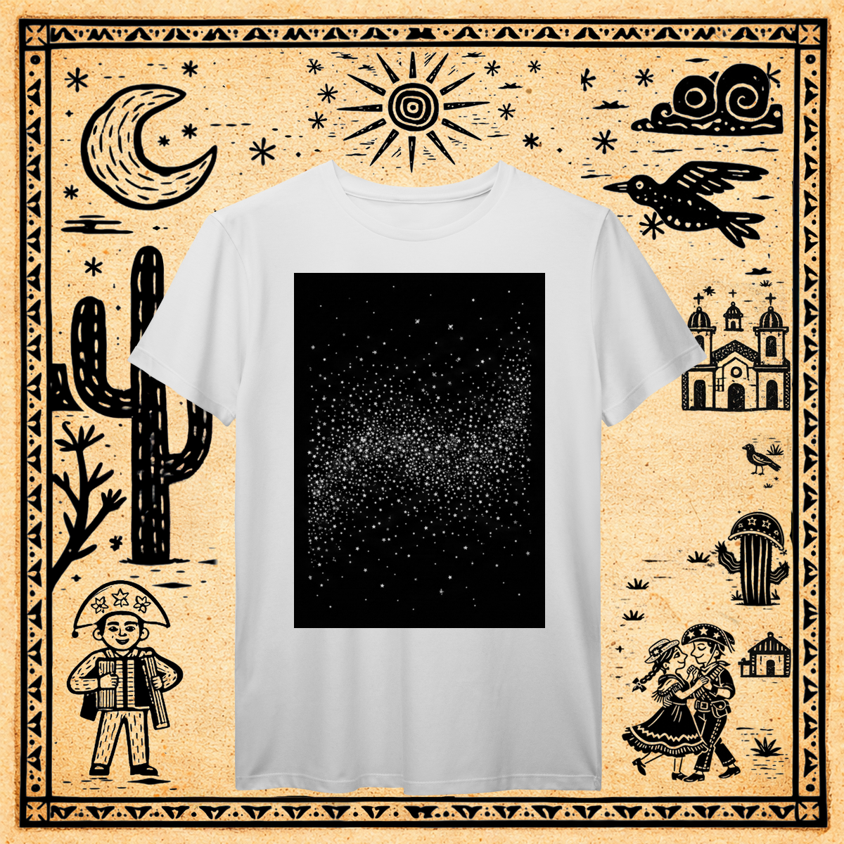 Sobre um fundo preto profundo, uma nuvem densa e concentrada de milhares de pequenos pontos brancos, cruzes e formas geométricas minúsculas forma uma faixa rodopiante no centro, evocando a textura do "caos organizado" da Via Láctea.