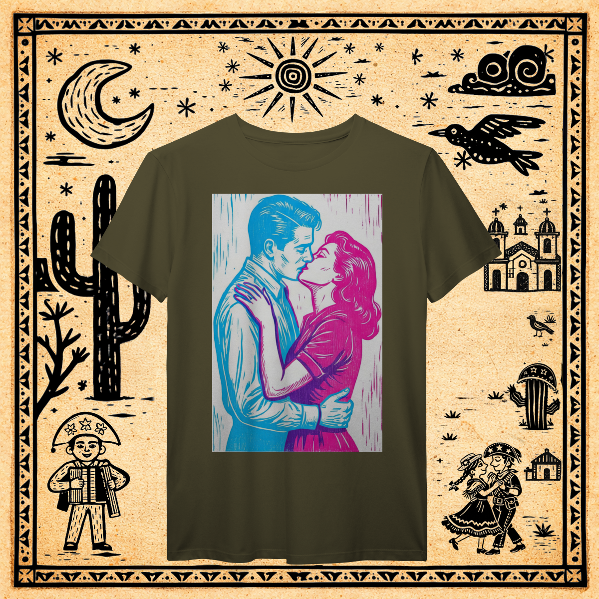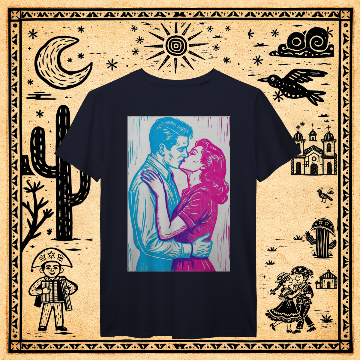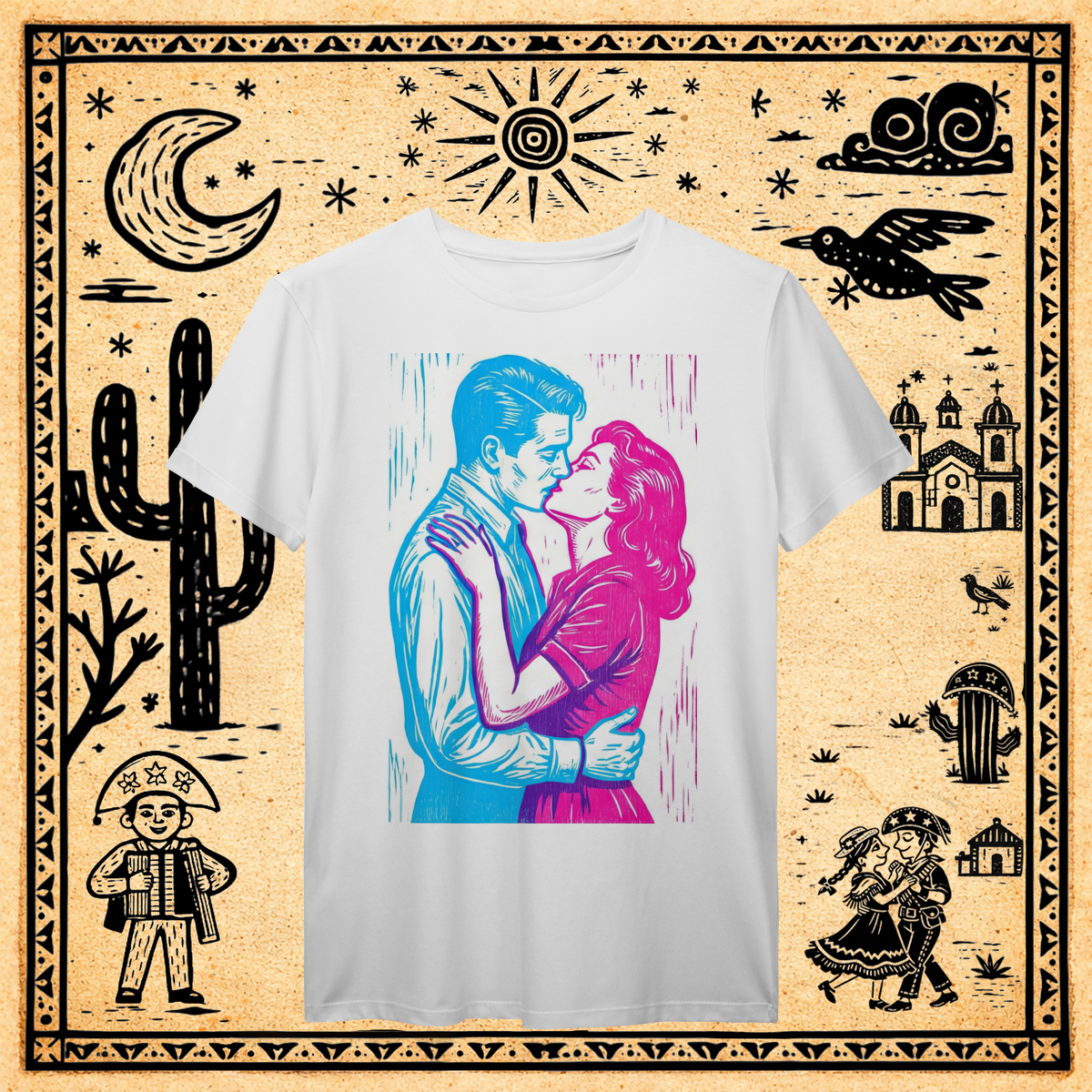 O misprint (erro de impressão) proposital, com o desalinhamento vibrante entre o azul turquesa elétrico e o rosa choque, cria uma vibração visual que tira a arte popular do passado e a joga direto no presente.